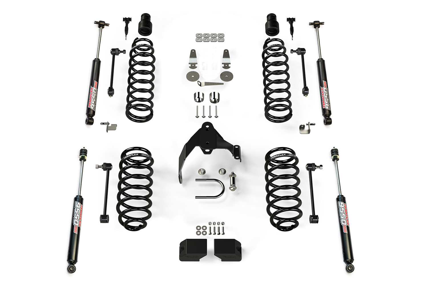 Coil Spring Base Lift Kits are offered with TeraFlex 9550 VSS Twin-Tube Shocks or without shock absorbers.