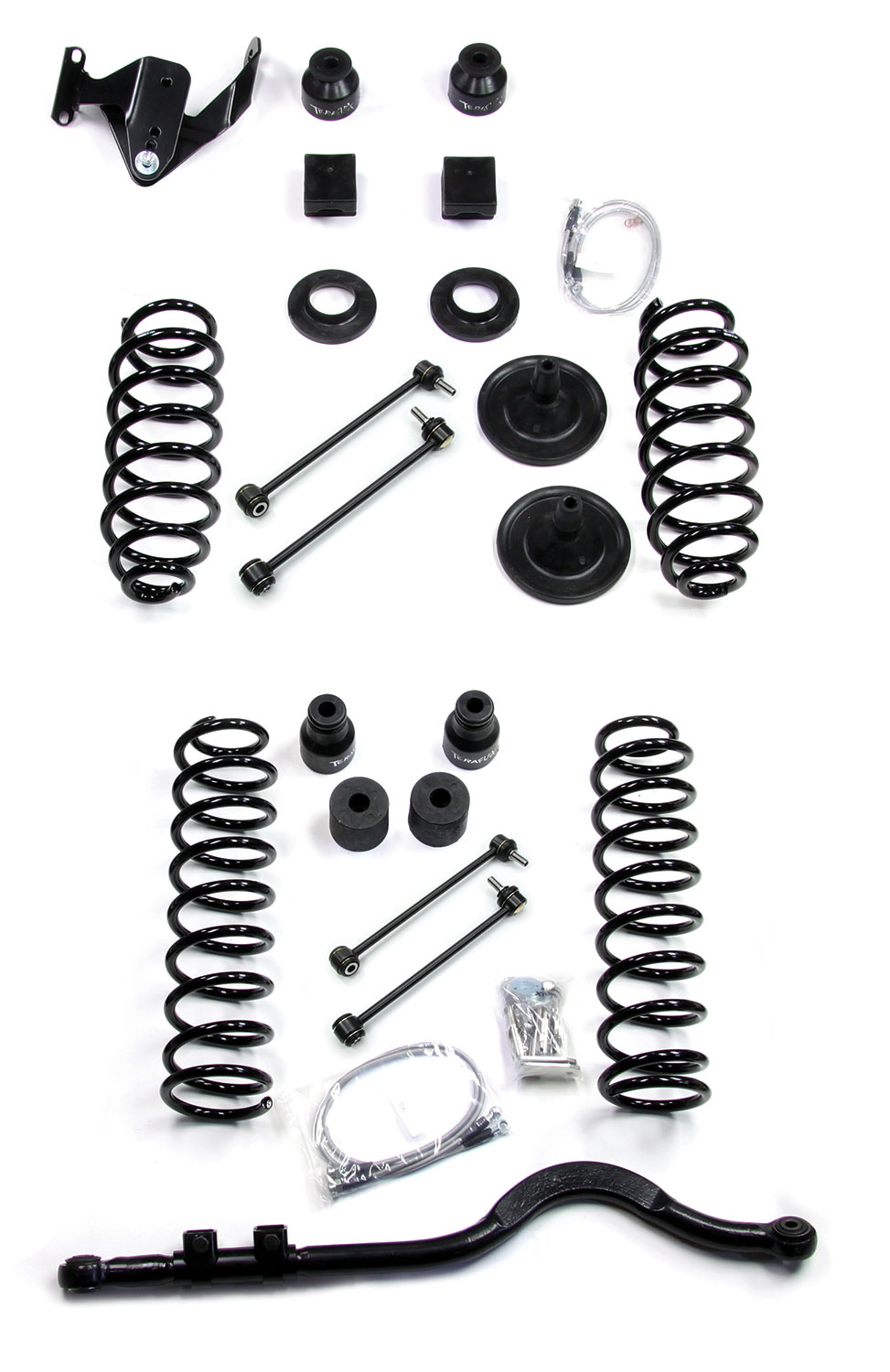 The TeraFlex JK 4dr: 4 Inch Coil Spring Lift Kit w/ Track Bar includes just the basic lift components only and doesn't have the drivability of a full suspension system. Requires longer preset or adjustable control arms to correct suspension geometry. An adjustable rear track bar is recommended.