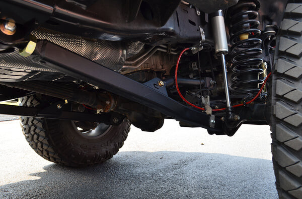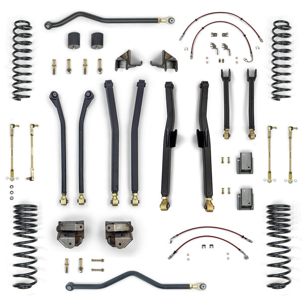 Elevate your lifted Jeep's performance with our complete Premium long arm system, designed for improved ride quality, superior off-road flex, and durability.