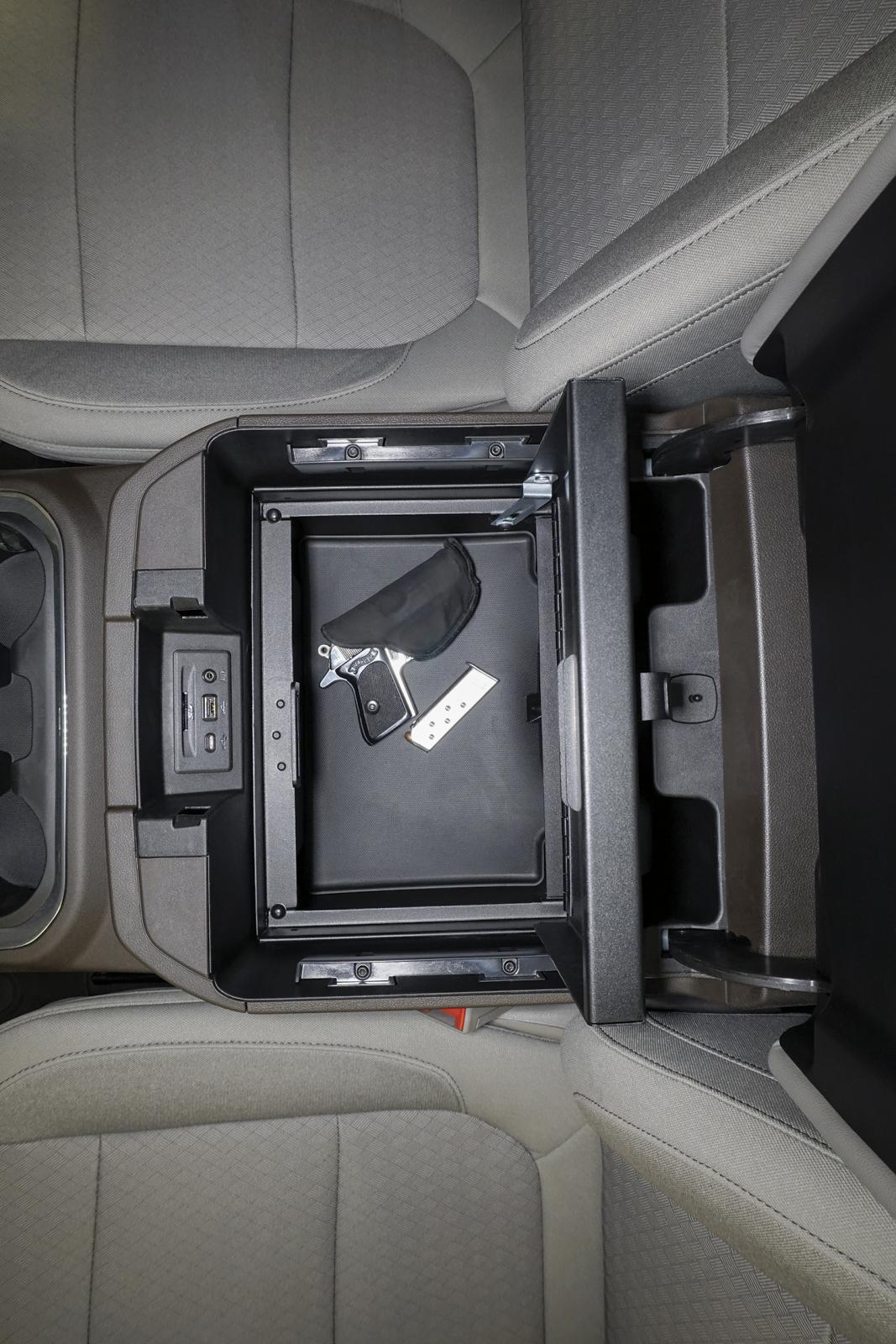 The safe maintains a completely stock look. Finished with a durable texture powder coat, the Console Safe comes ready to install and lasts a lifetime.